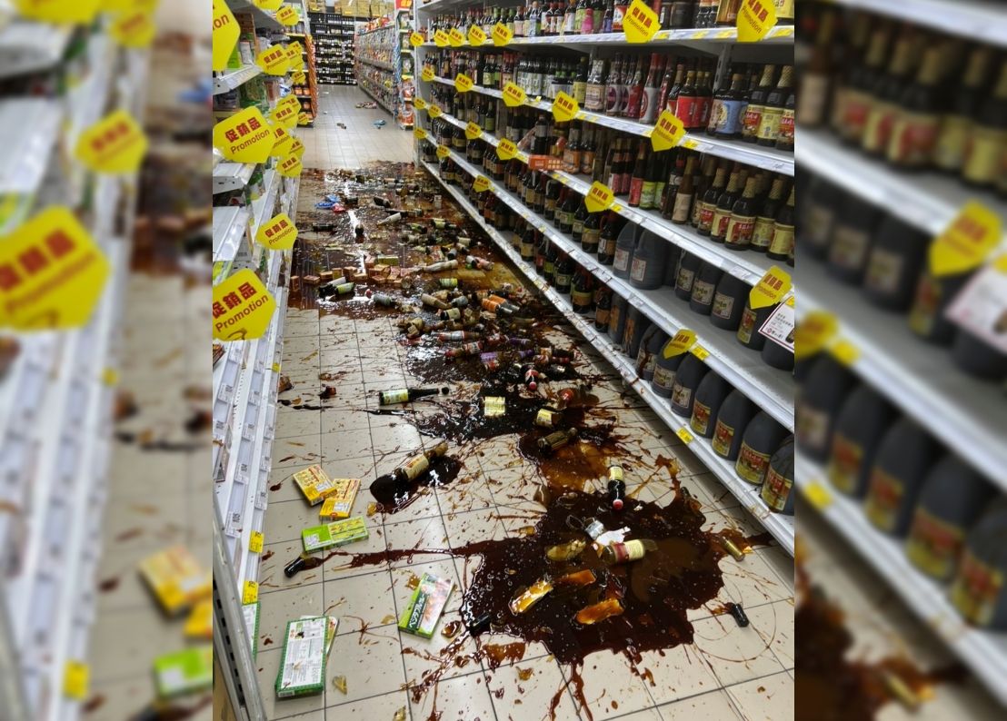 ▲台東大地震,賣場貨架上的玻璃瓶罐全都砸在地上。(圖/翻攝「記者爆料網」)