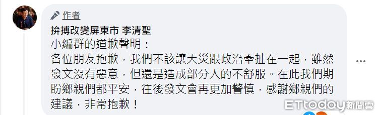 台東(17)日發生芮氏規模6.4強震,全台驚恐不少人一夜無法成眠,民進黨屏東市長參選人李清聖團隊卻在第一時間發臉文指「這是翻轉屏東市的徵兆嗎」,貼文後還附上笑臉符號,挨轟冷血;李清聖18日下午對此致歉;他表示,小編經驗不足,一時疏忽犯錯,但仍說「但要給他們機會」。