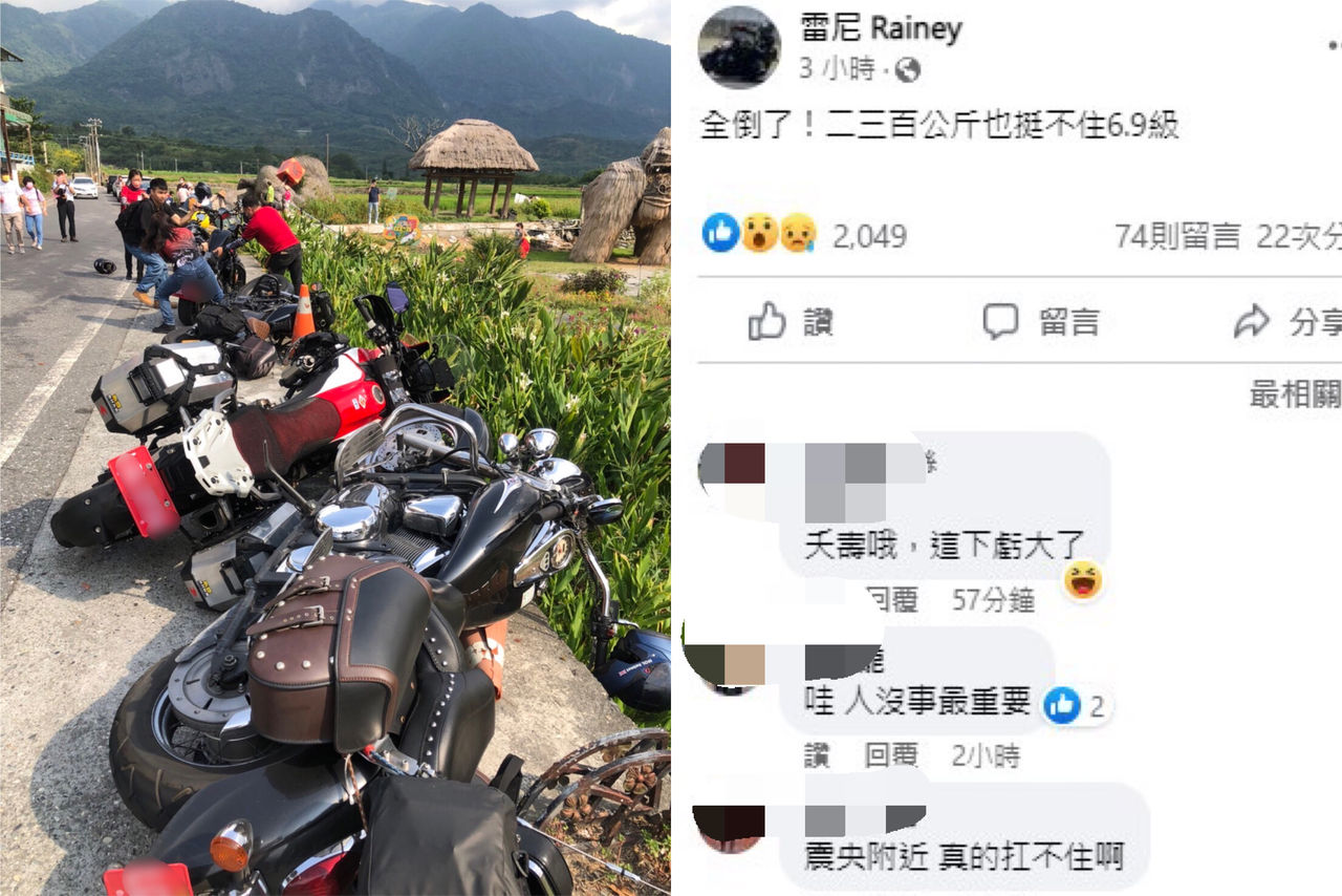 今(18)日14時44分台東縣池上鄉發生規模6.8地震,花東地區傳出嚴重災情,富里鄉農會旁知名景點稻草藝術季,因假日有許多人潮,不料地震劇烈搖晃,原本排在一塊的4台紅牌重機瞬間變成骨牌倒車,3位民眾趕緊聯手救起愛車。某車行老闆透露,這幾款重機應是進口,若是車頭歪掉恐維修費相當可觀。