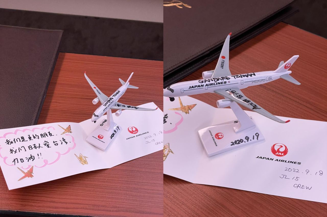 ▲日航空服員送上手寫卡片和飛機模型為台灣加油打氣。(圖/高睿騰授權提供,請勿翻攝)