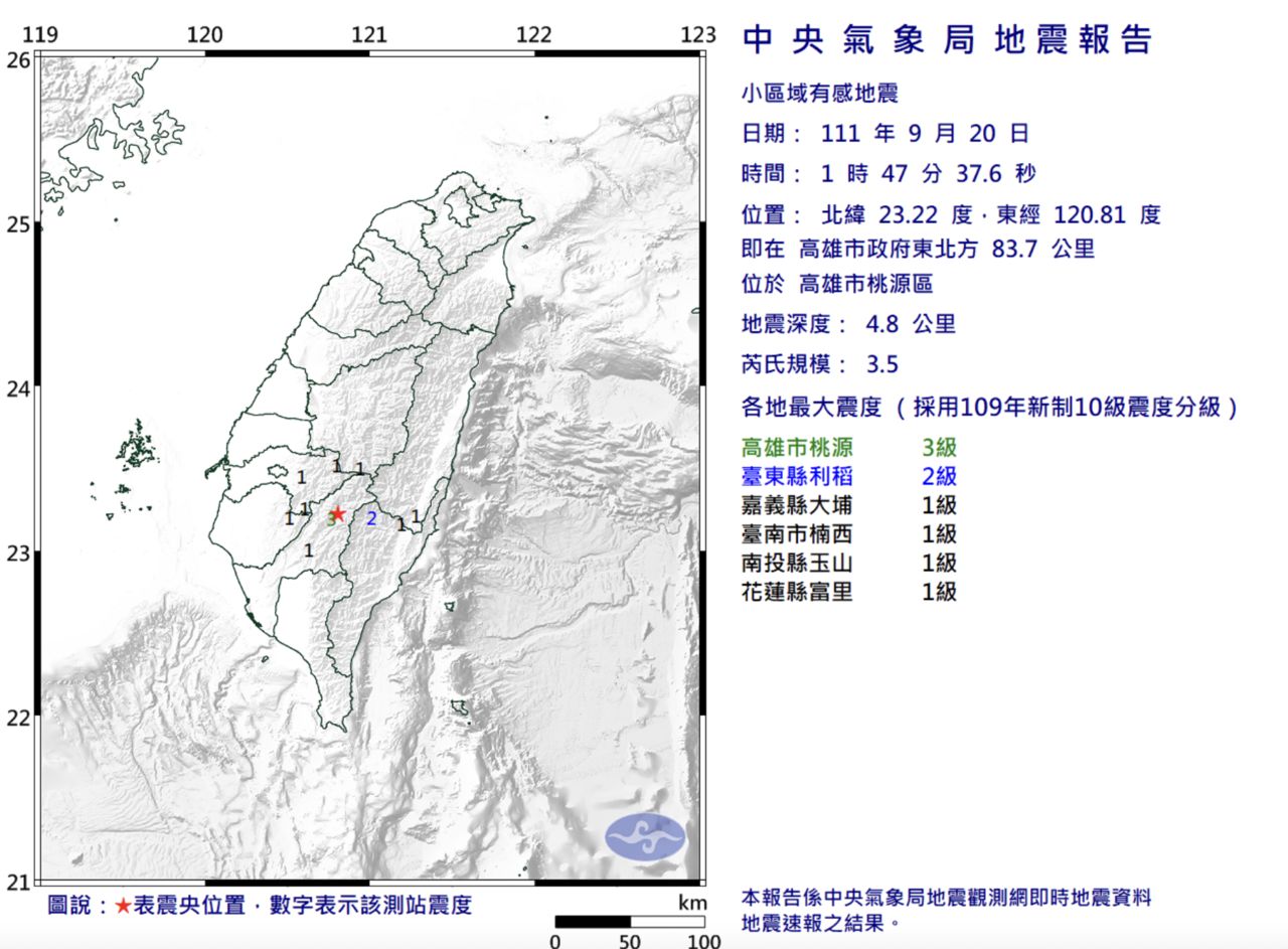 高雄市20日凌晨1點47分發生芮氏規模3.5地震,震央位於高雄市政府東北方83.7公里(高雄市桃源區),地震深度4.8公里。