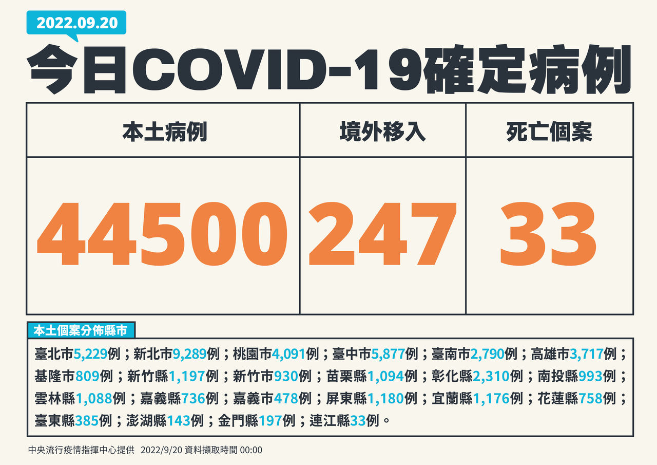 指揮中心表示,今日新增之44,500例本土病例,為20,865例男性、23,621例女性、14例調查中,年齡介於未滿5歲至90多歲以上;個案分布為新北市9,289例,臺中市5,877例,臺北市5,229例,桃園市4,091例,高雄市3,717例,臺南市2,790例,彰化縣2,310例,新竹縣1,197例,屏東縣1,180例,宜蘭縣1,176例,苗栗縣1,094例,雲林縣1,088例,南投縣993例,新竹市930例,基隆市809例,花蓮縣758例,嘉義縣736例,嘉義市478例,臺東縣385例,金門縣197例,澎湖縣143例,連江縣33例。