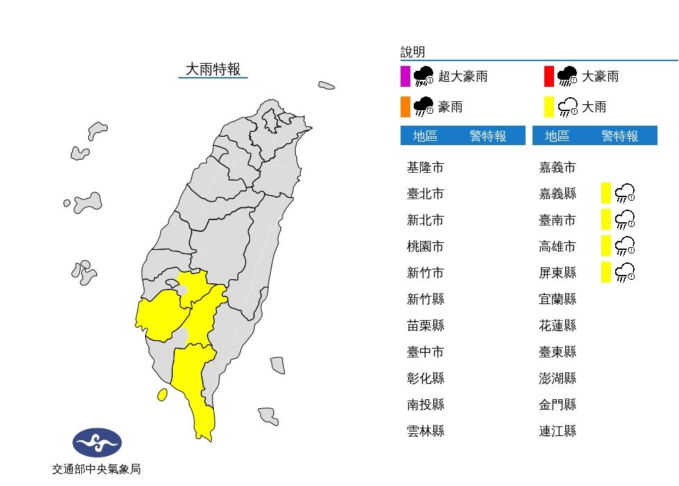 大雨特報:嘉義縣山區、臺南市、高雄市山區、屏東縣、恆春半島
