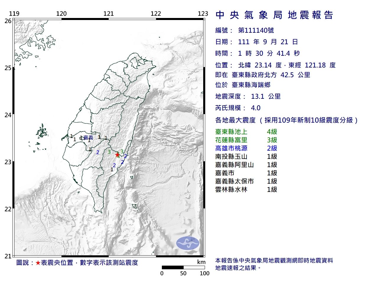 中央氣象局指出,台東縣海端鄉21日凌晨發生規模4.0地震,震央位在台東縣政府北方42.5公里。