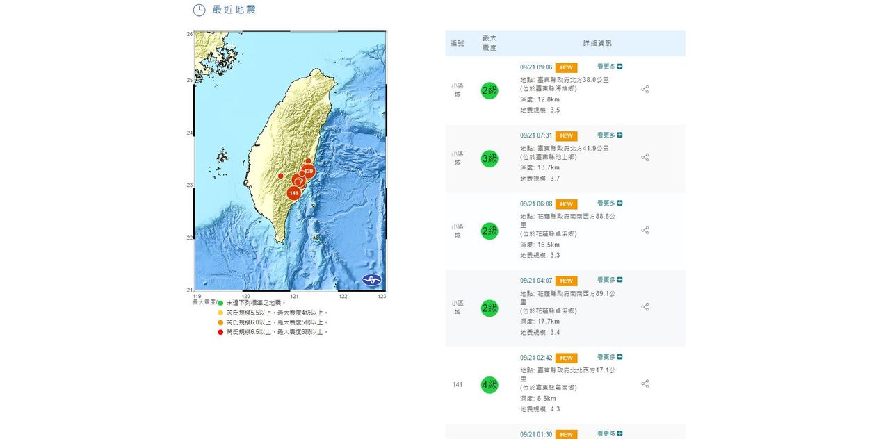 ▲9月21日一早花東地區發生至少5起地震。(圖/翻攝自中央氣象局)