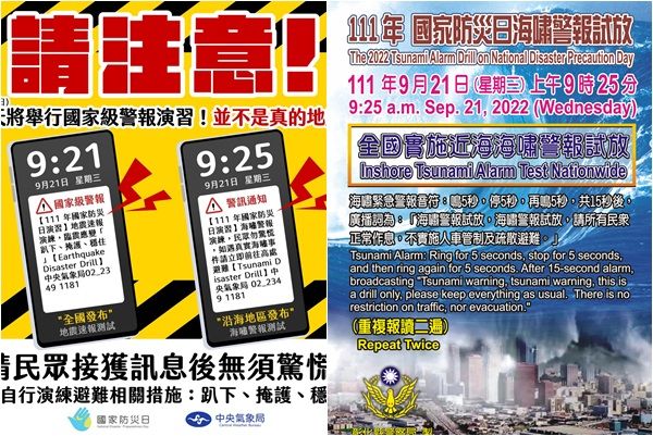 「111年國家防災日」海嘯警報試放,9月21日(星期三)上午全國將接收到測試警報,請民眾不需慌張,可以就地進行避難三步驟「趴下、掩護、穩住」的演習。另外,彰化也於上午9:25分試放海嘯警報。