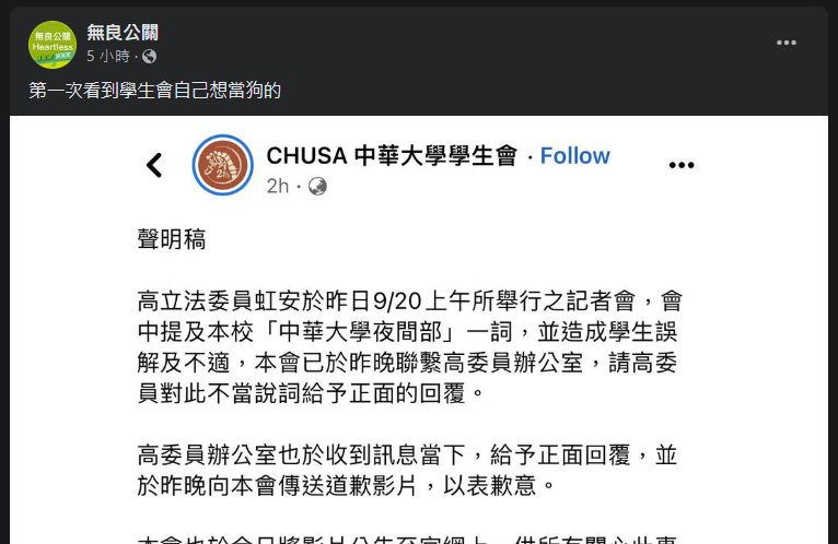 民眾黨新竹市長參選人高虹安在記者會上,為暗諷前新竹市長林智堅抄襲案而提及「中華大學夜間部」,被認為是在戰學歷,事後也為用詞道歉,中華大學及中華大學學生會都已接受。對此,綠營側翼粉專「無良公關」截圖發文表示,「第一次看到學生會自己想當狗的」。