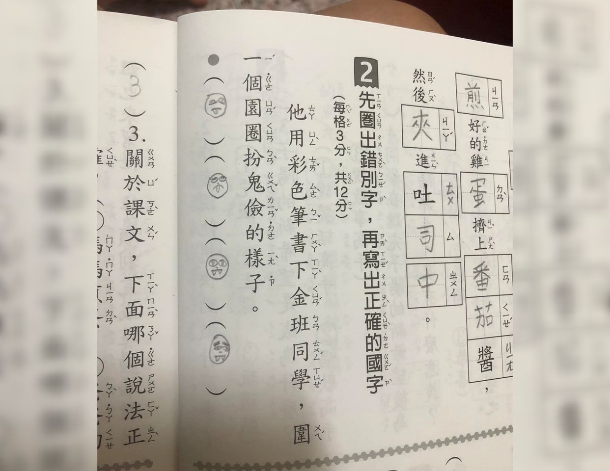 原PO在臉書「爆廢公社公開版」分享一張照片,是女兒的作業,題目要求先圈出錯別字,再寫出正確的國字,「他用彩色筆書(畫)下金(全)班同學,圍一個園(圓)圈扮鬼儉(臉)的樣子」,正確答案應該是畫、全、圓、臉,女兒卻在答案欄畫下4個鬼臉,而且表情都不一樣,讓她覺得好氣又好笑,「每次看作業我都會提醒自己記得呼吸!」
