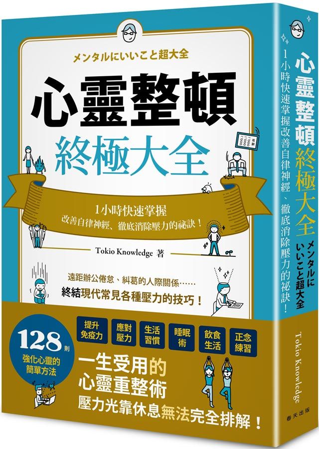★本文摘自春天出版社《心靈整頓終極大全:一小時快速掌握改善自律神經、徹底消除壓力的秘訣!》,作者Tokio Knowledge,大家都懂的事情或許不是很懂,大家都不懂的事情卻意外瞭解的創意團隊。成員包括律師、節目企劃、知名企業廠長、設計師、茶道師、作家、智庫軟體工程師、插畫家、攝影師、報社記者、非國家資格公務員、自由工作者、家庭主夫等。本書提供128則強化心靈的簡單方法,帶領讀者如何從不同層面找回心理健康。包括如何改善自律神經,怎麼面對人際關係,如何跟壓力、維護身心健康等。
