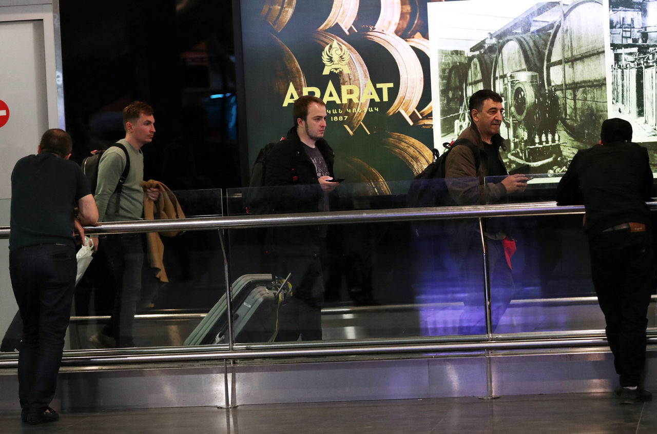 ▲普丁宣布部分動員令後,俄羅斯民眾搭機抵達亞美尼亞。(圖/路透)