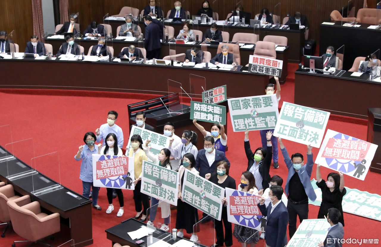 國民黨團在場內齊喊出「防疫失能,道歉負責」、「阻擋疫苗,抹黑慈濟」、「疫苗受害,求助無門」等口號。大約在一小時過後,曾銘宗返回議場指出,經黨團協商結果,各黨團同意本(23)日院會進行至報告事項處理完畢, 27日(周二)再進行行政院長蘇貞昌施政報告並備詢,曾銘宗表示,蘇貞昌下周二報告時會表達意見,國民黨團立委才陸續撤下主席台,立院恢復議程進行。