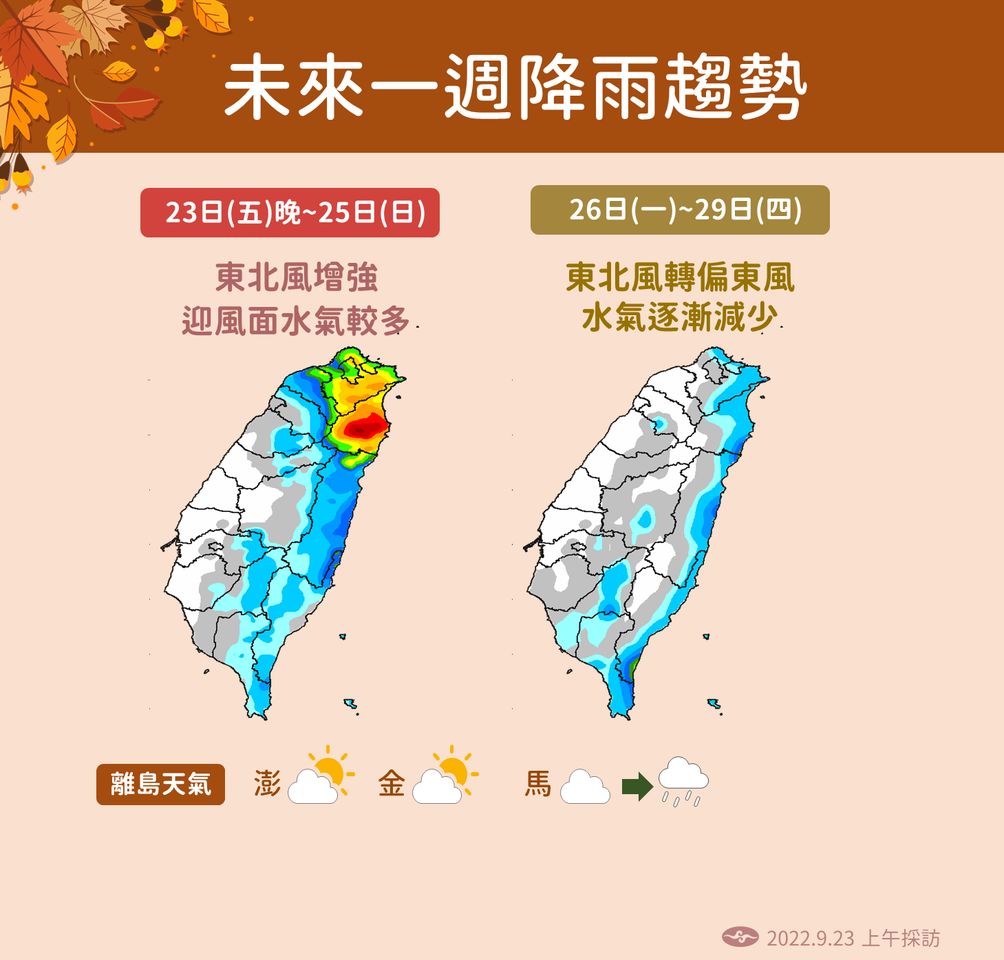 今晚開始到週日持續受到東北風影響,北部、東半部、恆春半島等地有局部短暫陣雨,北部、東北部高溫也會略降,各地早晚低溫約23度,另颱風「塔拉斯」將往日本移動,颱風「諾盧」則往中南半島前進,雙颱對台都沒有影響。