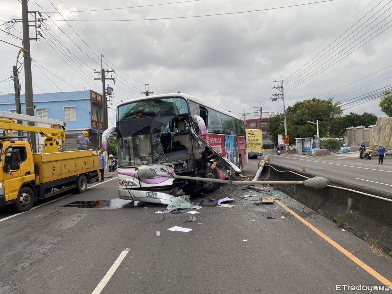 ▲國光客運公司大巴士在佳冬鄉台17線路段撞紐澤西護欄,車頭受損 。(圖/記者陳崑福翻攝,下同)