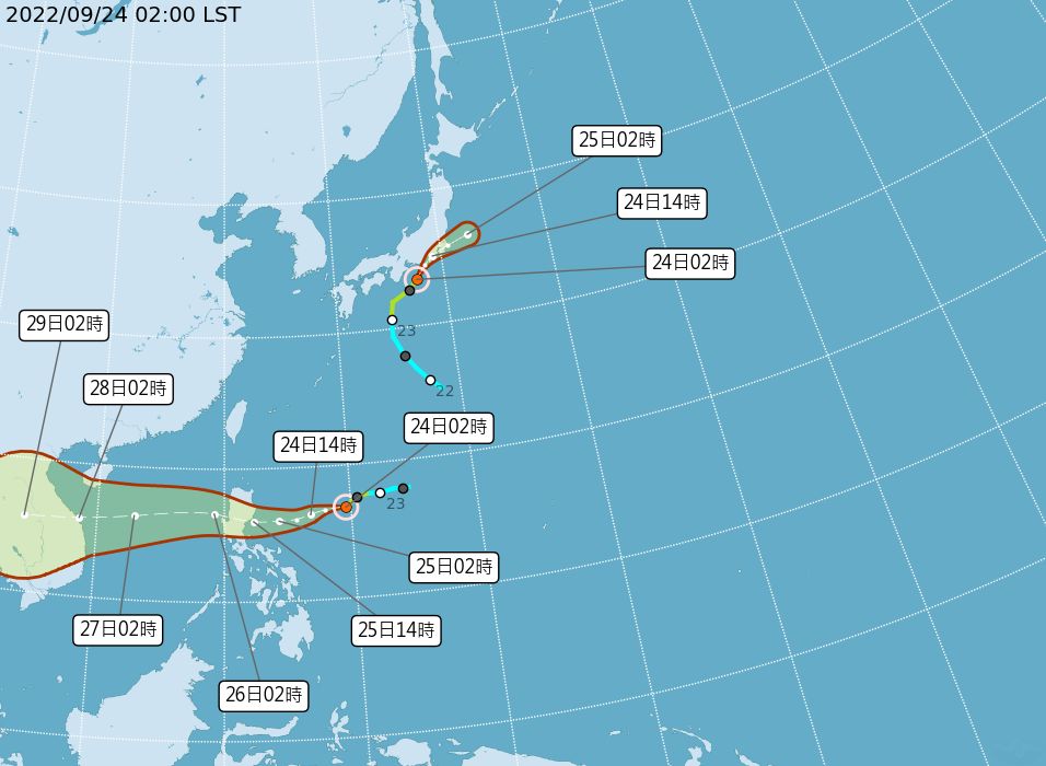 ▲輕度颱風塔拉斯今變性為溫帶氣旋,諾盧颱風朝越南方向前進,對台沒有影響。(圖/氣象局)