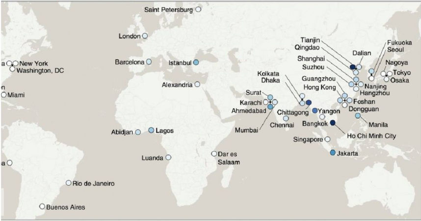 這些城市包括中國天津、越南胡志明市(Ho Chi Minh City)、孟加拉吉大港(Chittagong)、緬甸仰光(Yangon)、印尼雅加達(Jakarta)、印度艾哈邁德巴德(Ahmedabad)等,多個城市在高峰年間皆下沉20多毫米。