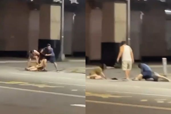 畫面中可以看見,黑衣男先和女子發生扭打,隨後被藍衣男一個過肩摔摔到一旁,並用腳壓制在地,還有一名白色背心男從旁協助,女子驚恐不斷尖叫,互毆過程全被路過民眾拍下。