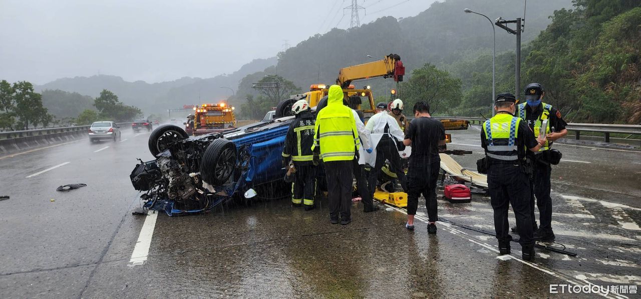 國道三號南下5公里處25日下午1時38分發生自撞事故!一輛轎車不明原因發生自撞,車輛當場翻覆,四腳朝天躺在路中,車內疑似有人員受困。警消獲報趕抵現場,緊急出動破壞機具救援,目前仍在搶救當中,至於詳細事故原因仍待調查釐清。