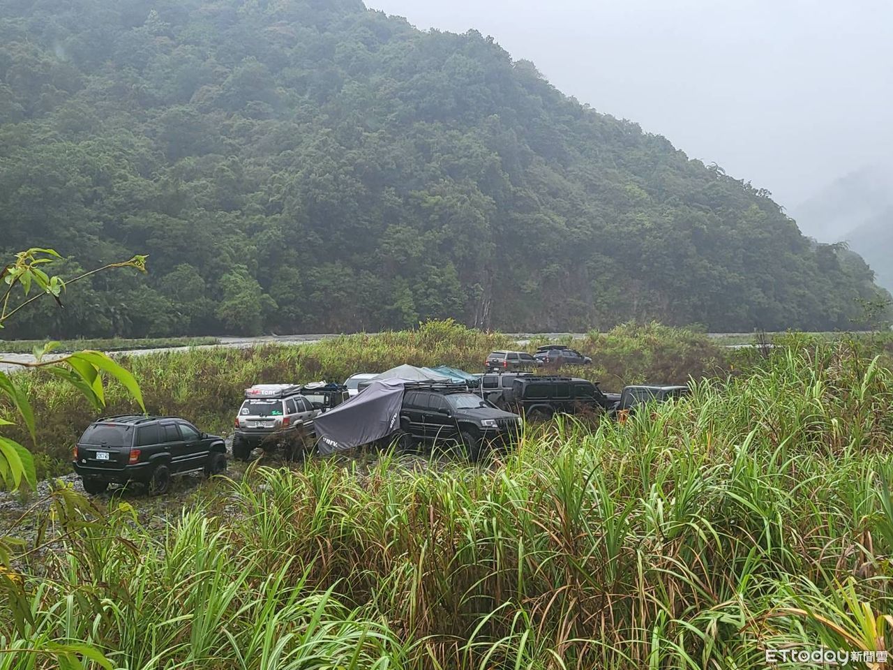 ▲25日露營受困清水地熱野溪溪床的10車23人(上圖),經怪手挖砂石改變水位,已安全撤離。(圖/記者游芳男翻攝,下同)