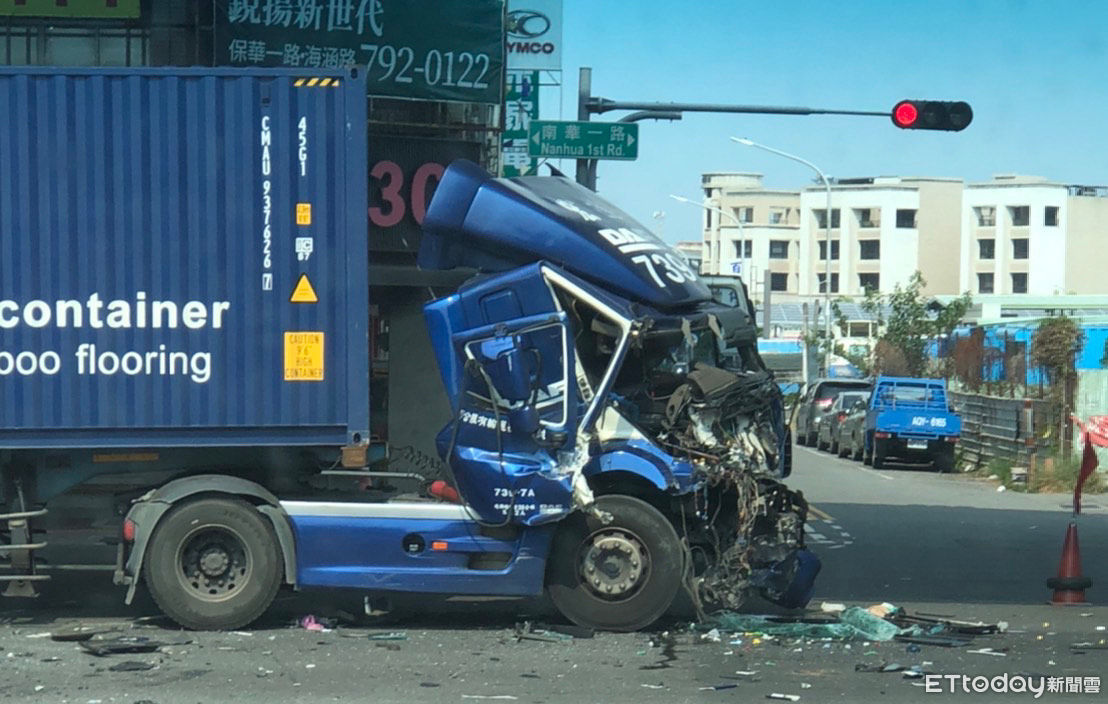 ▲鳳山南華一路、鳳頂路口貨櫃車追撞車禍,車頭嚴重毀損。(圖/翻攝自記者爆料網)