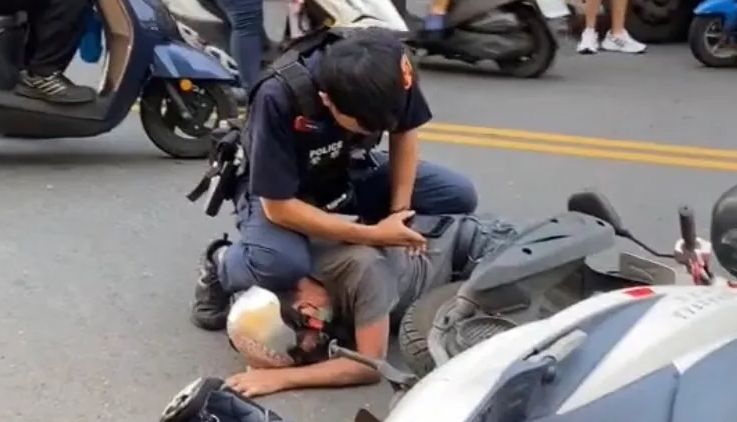 畫面中可見,警用機車和男騎士的機車倒在馬路中央,引起周圍民眾圍觀,而警員用單手將男騎士壓制在地上,另手則拿著手機在輸入資訊。