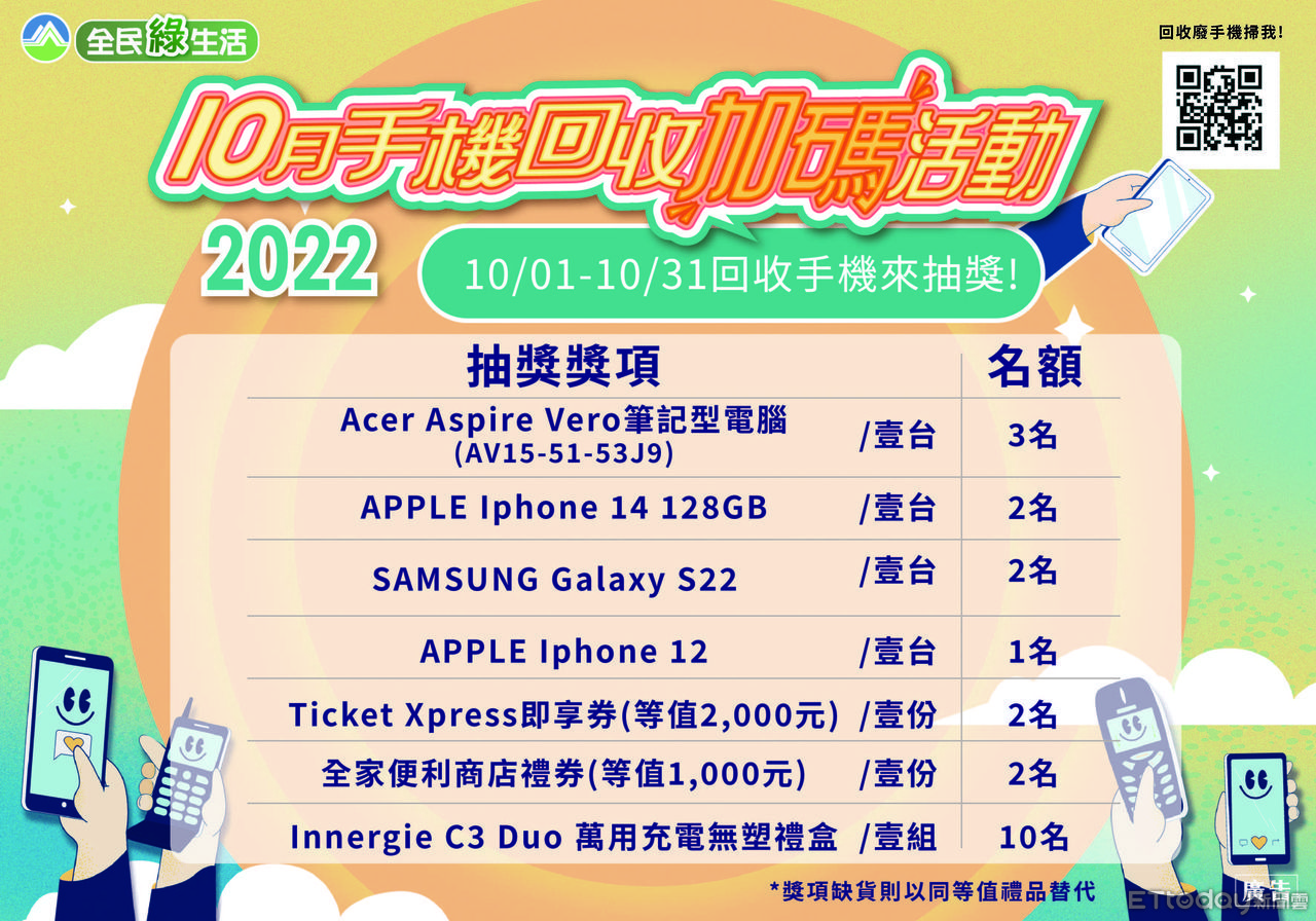 屏東環保局邀請您透過「檢」、「刪」、「排」三步驟,「檢」視留置家中壞掉或不再使用的手機,回收前自行先「刪」除個資,並於111年10月1日起至10月31日活動期間內,「排」出交付屏東環保局指定站回收,每支手機可兌換1瓶環保洗碗精外,另可獲得1張抽獎序號,有機會得環保署提供之筆記型電腦及手機等多項獎項。