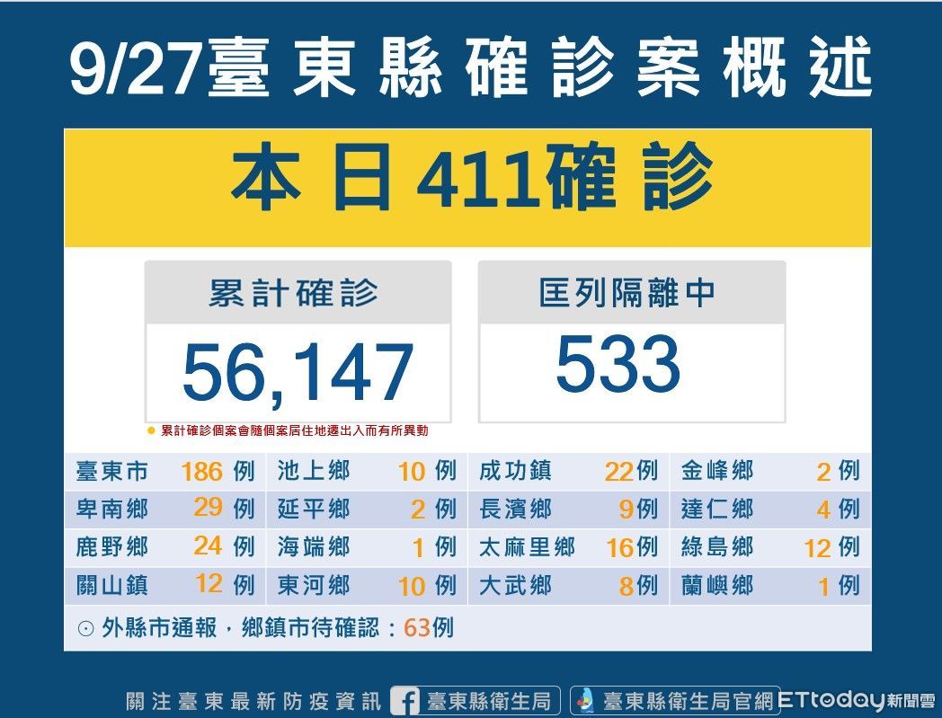 台東縣27日新增411位確診者,348名民眾戶籍或居住地分在台東、63名為外縣市醫院通報。目前台東縣累計確診個案56147人、居隔者533人。針對COVID-19確診者分流收治情況,台東縣截至9/26下午16點為止,住院收治人數為31、加強版集中檢疫所為47人、居家照護現管人數有2276人。