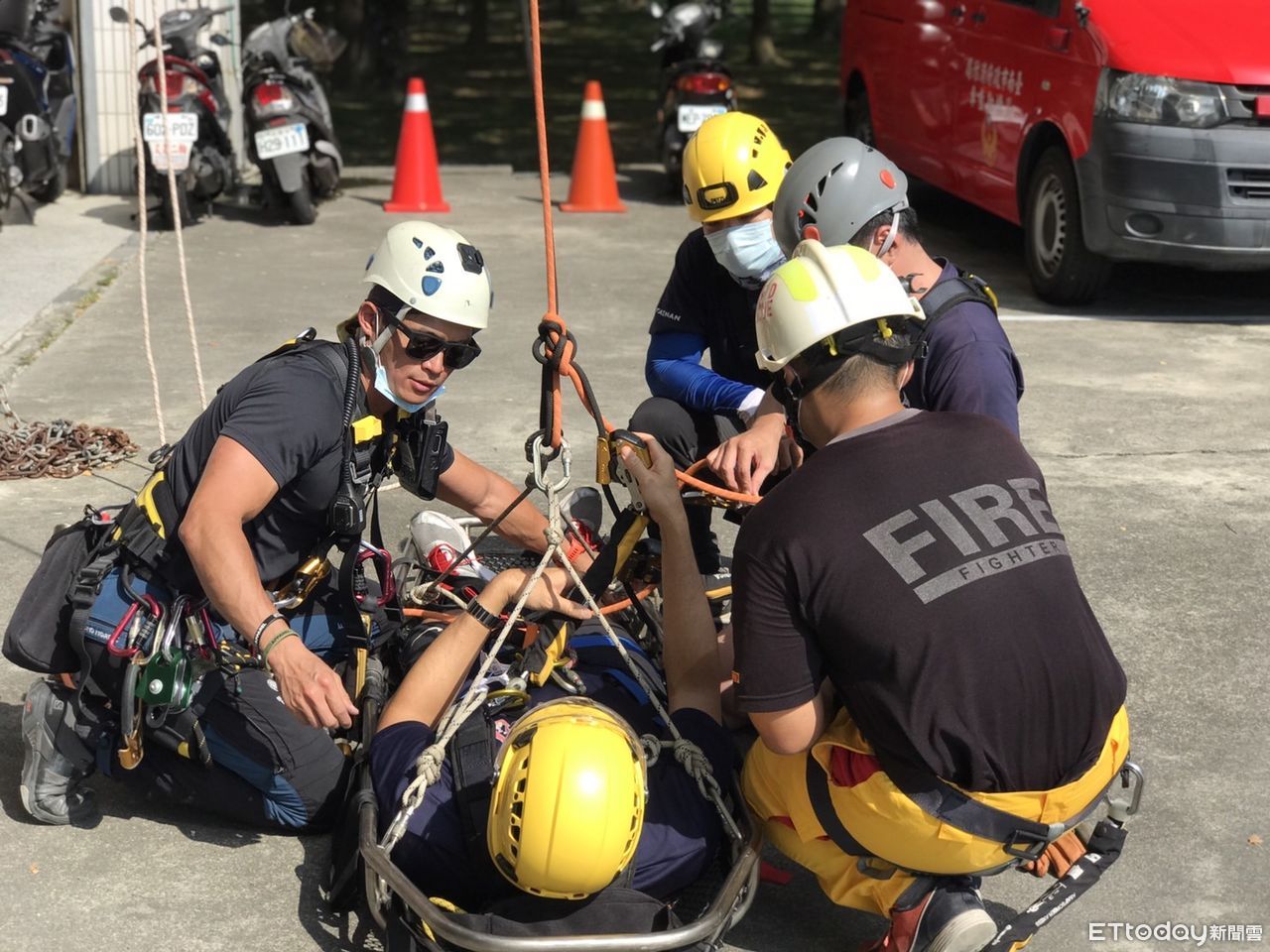 另為強化救災能量及活用救災技巧,下午由繩索救援種子教官透過情境項目,驗收消防人員繩索應用之救援技能,藉由不同情境加深繩索技術、安全確保、防墜及雙繩系統等基本觀念。完成火搶及救助的相關訓練後,緊接著由同仁分組實施常年訓練七項體能測驗,藉以分析各分組體能強弱項目,規畫更為妥適之訓練項目,精進消防人員基礎體能。