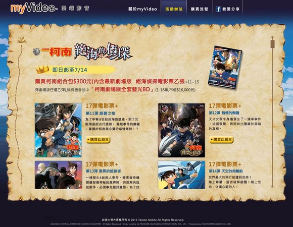 柯南迷注意啦! 愛柯南不只要進電影院,更要平板/電腦/手機隨時隨地隨身看!即日起至 7/14,購買最新【絕海的偵探電影兌換劵】+【myVideo 卡通館柯南劇場版第 11~15 彈任一彈】只要 300 元,還有機會得到全套柯南劇場版藍光 BD 唷!