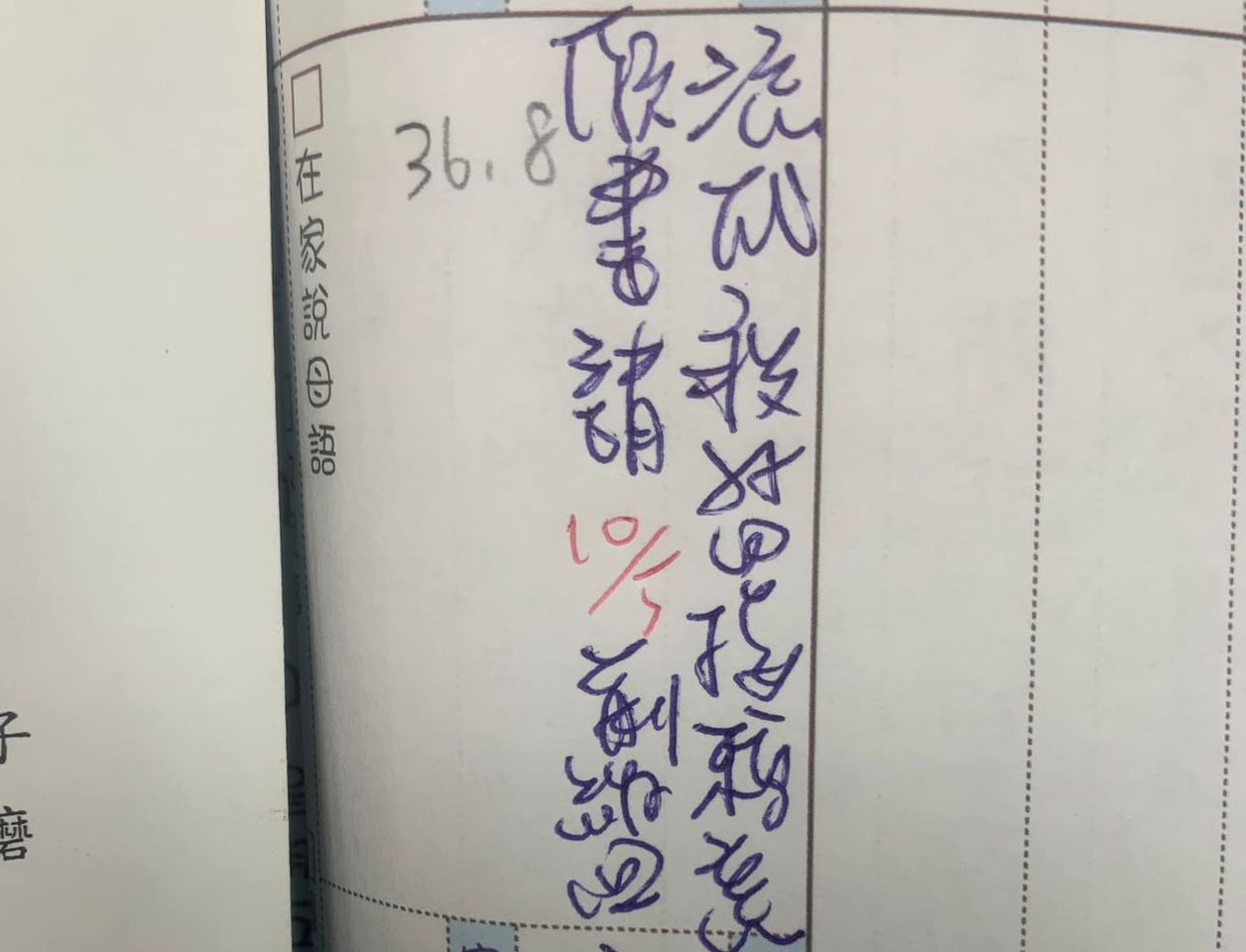 原PO在臉書「爆廢公社二館」的文章中提到,「跪求翻譯,女鵝(兒)的代課老師到底在寫啥?」他只看得懂「10/5前」以及「回」這兩個部分。而在附上的照片中,只見老師用藍筆在聯絡簿上寫下一段話,其中日期還用紅筆標記,旁邊還有用鉛筆寫上的體溫紀錄。