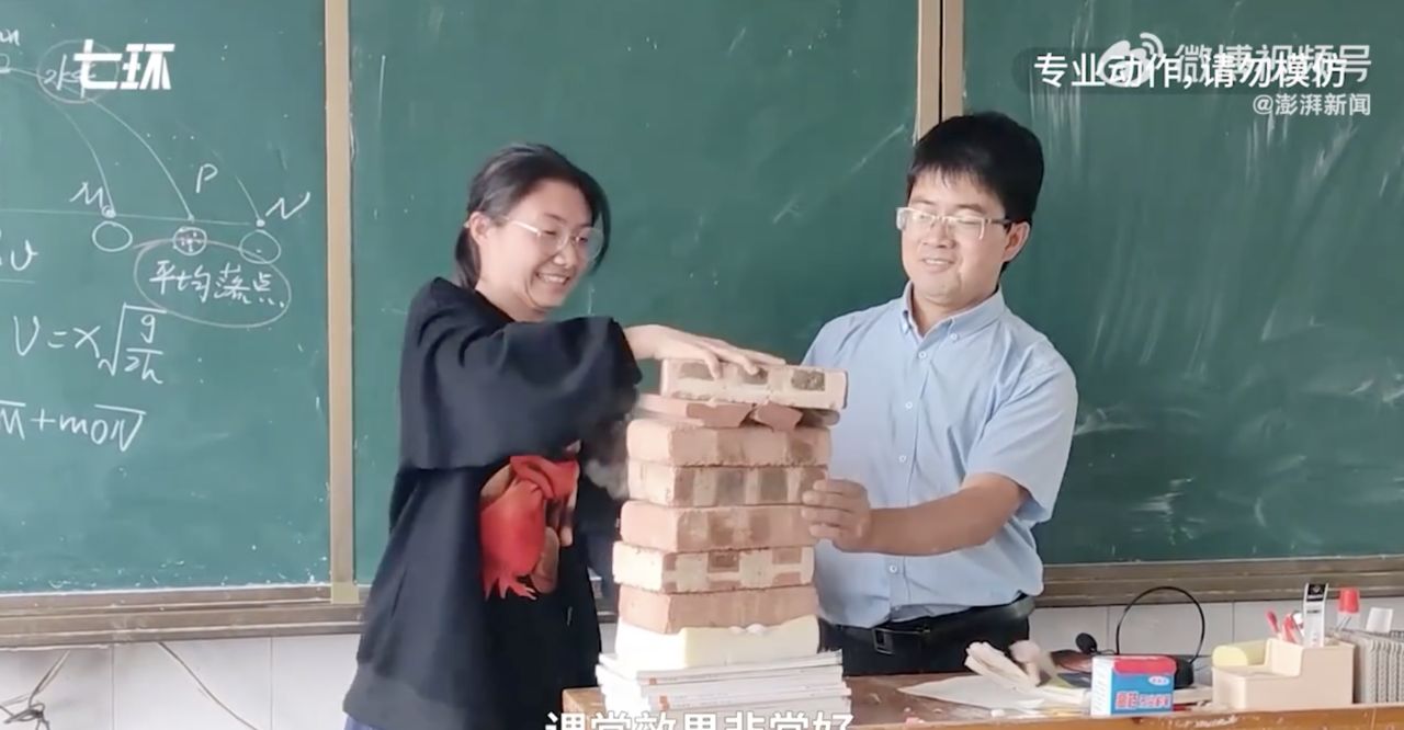 大陸一名物理老師劉華東為了增加課堂上的趣味,利用實際操作模擬「胸口碎大石」的原理,把枯燥的物理公式變得「活靈活現」。劉華東把「紅磚」搬到教室裡做實驗,經過示範後,還讓一名女學生上台實作,他表示,「做實驗能讓孩子們更容易理解知識點,也對物理課更感興趣。」