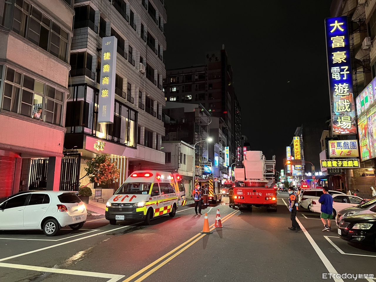 ▲台南市中西區尊王路某商旅晚上煙霧瀰漫傳火警,市警二分局警網到場管制交通,消防人員疏散旅客,經查係商旅旁隔壁5樓住家因烹飪不慎燒焦起濃煙而虛驚一場。(圖/記者林悅翻攝,下同)