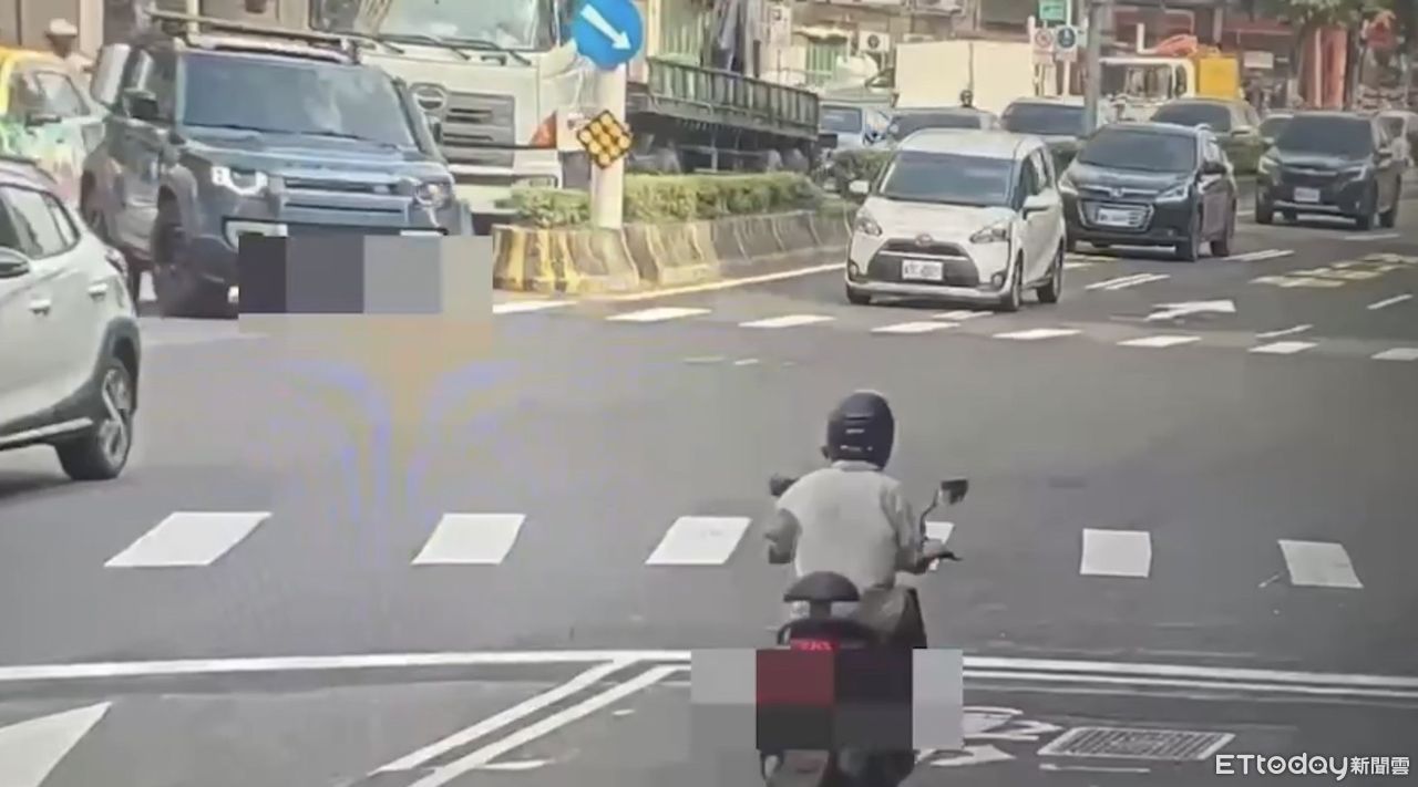 ▲監視器拍下肇事女駕駛違規左轉撞上騎士,零件噴飛險傷外送員。(圖/記者邱中岳翻攝)