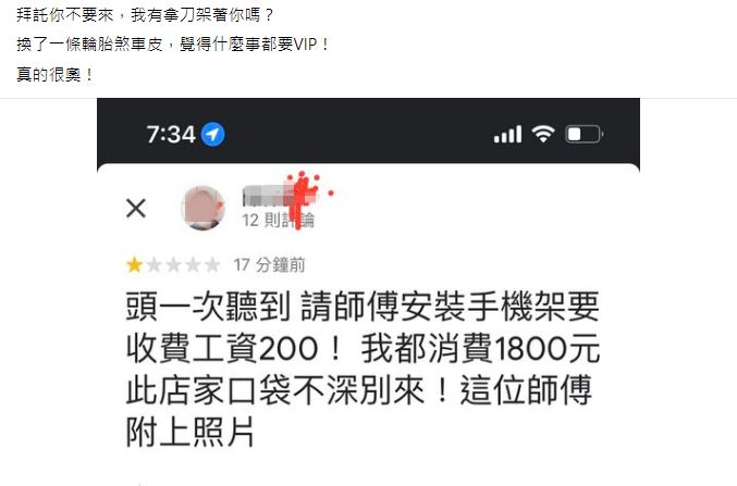 一名修車行老闆在臉書PO文,表示有奧客才花小錢就想要店家免費安裝手機架,覺得什麼事都要VIP,要不到就上Google評一星留言,讓她無奈直說「真的很奧」!