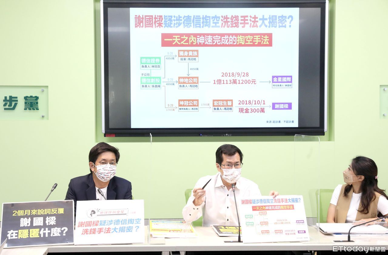 台北地檢署今年8月偵結德信證券掏空案,依違反《證交法》非常規交易、特別背信及《洗錢防制法》等罪嫌起訴德信證券前董事長林冠百、德信創管董事長吳昌陽、服飾品牌獨身貴族少東馮冠皓3人。不過,民進黨立法院黨團上週質疑謝國樑涉及該掏空案,今上午再度舉行「地球呼叫金星二部曲,謝國樑疑涉德信淘空洗錢金流大揭秘」記者會。