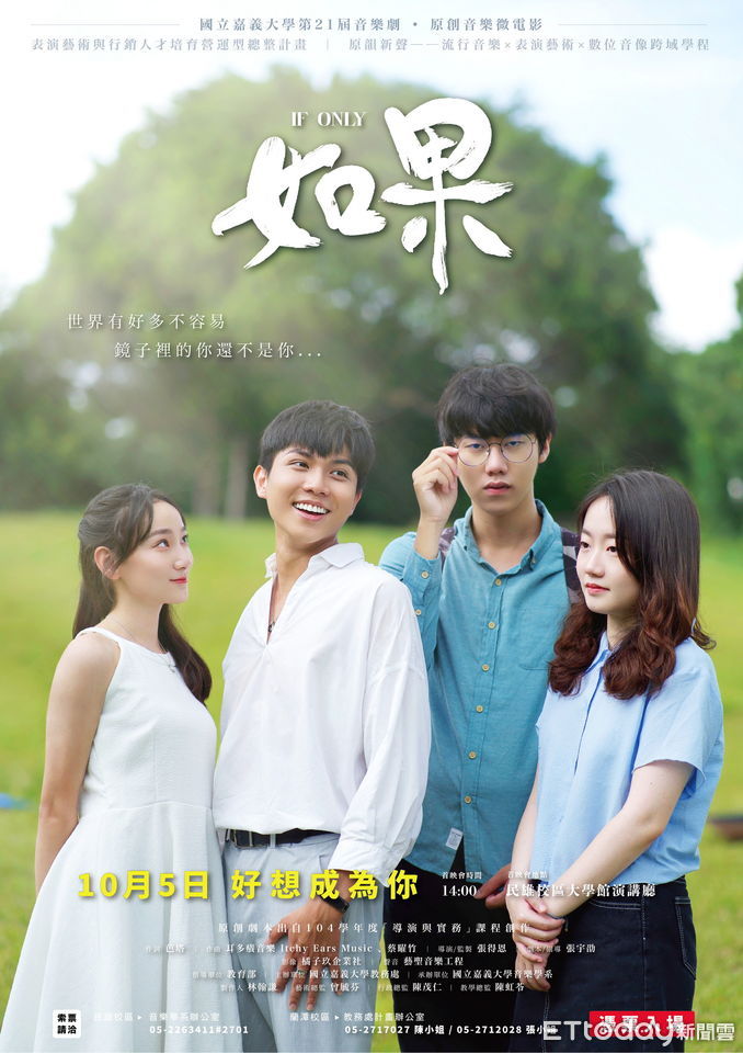 嘉大極具盛名的音樂劇演出,今年首次以「原創音樂微電影」方式呈現,原創劇本出自104學年度「導演與實務」課程製作,由嘉大音樂系學生擔綱演出,希望為觀眾帶來耳目一新的體驗,邀請您一同欣賞這部兩個外型、個性迥異的男孩,在陰錯陽差之下交換了彼此的靈魂,進而改變人生找到真愛的勵志微電影。《如果.IF ONLY》音樂微電影搶先看:https://youtu.be/DNgUf6Z4Xik
