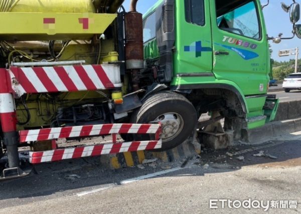 ▲▼跟隨後方的營業大貨車打滑失控向中間分隔島衝撞。(圖/楊梅警分局提供)