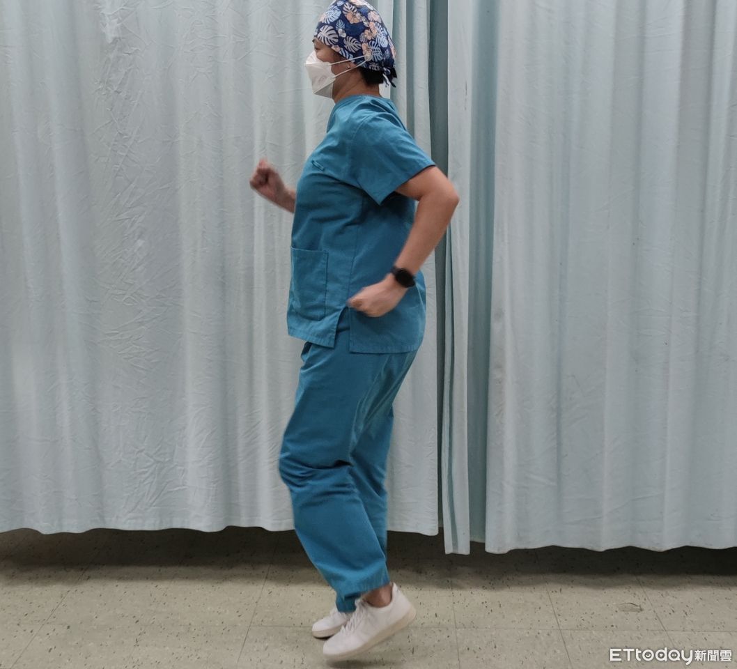 ▲圖7:配合鼻子吸氣、圓唇吐氣方式原地慢跑。(圖/台中榮總埔里分院提供)