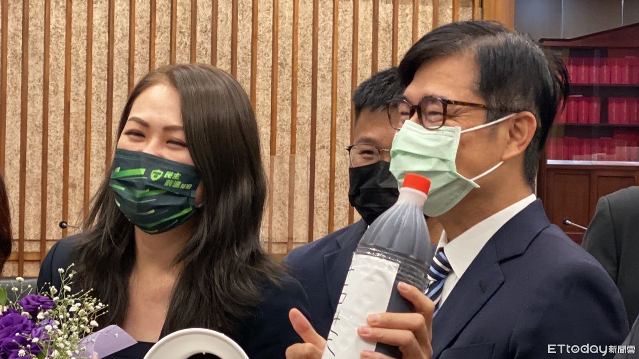 ▲爭取連任「意外落馬」!高閔琳最後總質詢,陳其邁暖送苦茶激勵。(圖/記者吳奕靖攝)