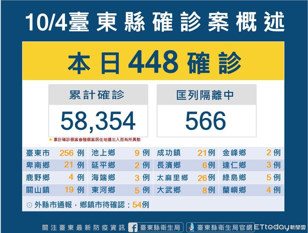 台東縣4日新增448位確診者,394名民眾戶籍或居住地分在台東、54名為外縣市醫院通報。目前台東縣累計確診個案58,354人、居隔者566人。截至10/4下午16點為止,住院收治人數為23、加強版集中檢疫所為74人、居家照護現管人數有1977人。