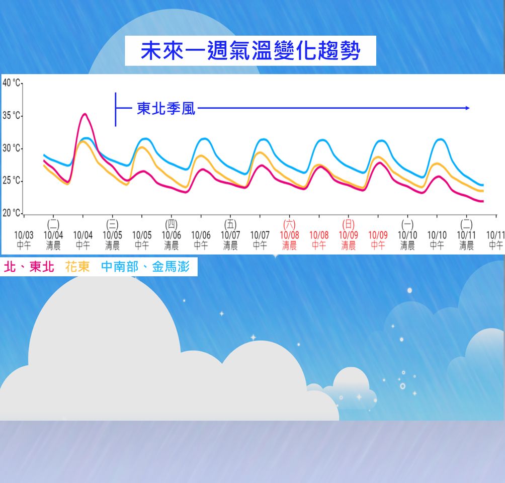 氣象局預報員黃恩鴻表示,明日東北季風增強,一早起來就能感受到風力變強,北台灣溫度下降明顯,高溫約26、27度,與今日的36度相比,等於下降10度左右,中南部不受影響,高溫仍有33到34度,各地早晚低溫則約23到24度。