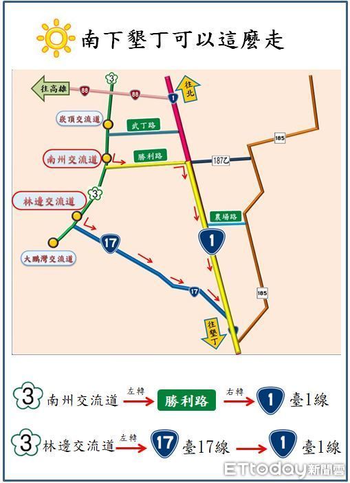 國慶日3天連假(8日至10日)即將到來,雖天氣轉涼,屏東縣政府警察局預計仍會有大批旅客湧入墾丁戲水,為疏解龐大旅遊車潮,警方除完善規劃各種交通疏導管制措施外,亦製作易壅塞路段替代道路指引圖,透過簡易圖片讓民眾預先了解替代道路,確保民眾快樂出遊、順暢返家。