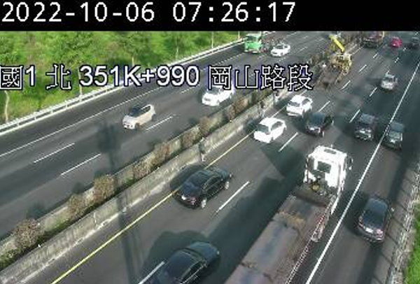高公局表示,今天7時13分,國道1號北向352k、岡山路段,發生4輛小客車追撞交通事故,目前占用內側車道進行處理,後方車流回堵約3公里。