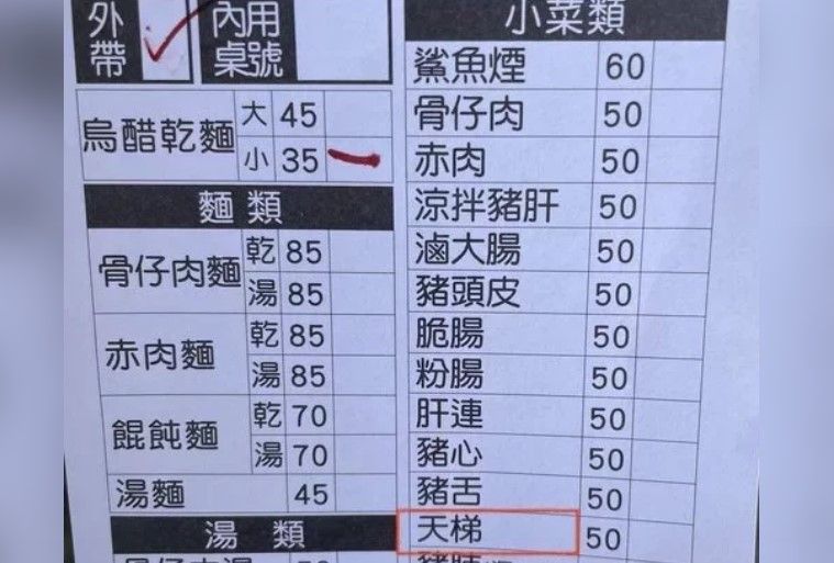 一名網友在PTT以「黑白切要怎麼點才專業?」為題發文,並曬出一張黑白切菜單,表示自己跟同事一起買午餐,突然想吃個黑白切,平時五臟六腑都吃過了,但今天在菜單上看到新玩意,名叫「天梯」,讓他深感疑惑於是詢問「有沒有人吃過?」