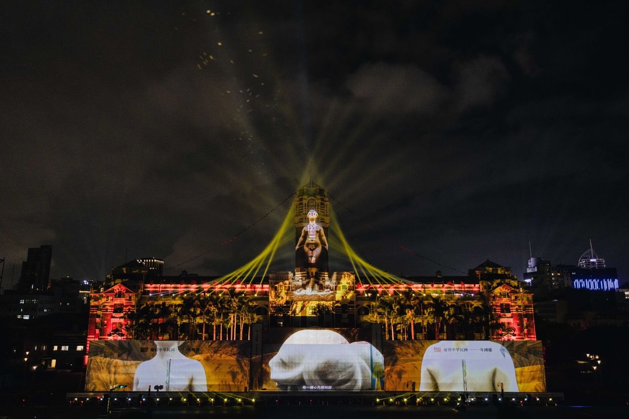 中華民國111年國慶光雕展演將於今(6)日晚間點燈,文化總會在5日試燈預演,壯觀畫面首度曝光!今年展演用超廣角布幕、巨型光雕投影,將總統府建築打造為「寶島戲院」,重現台灣跨足各領域的國寶級經典,包含10幅畫作、8首歌曲,25部電影、14幅手繪電影海報;而相隔一世紀後重現世人眼前的雕塑作品「甘露水」也壓軸登場。