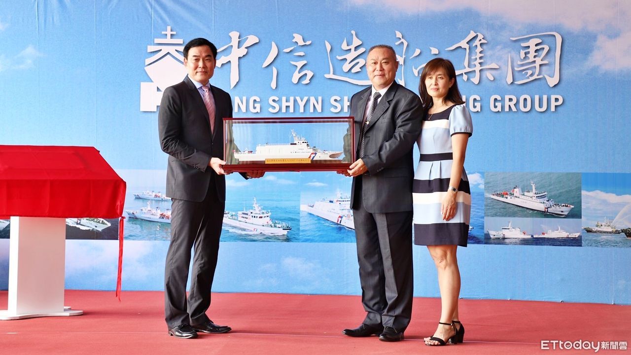▲最速艦第5艘安平級八里艦交船。海巡署主任秘書滕永俊賢伉儷(右)及艦隊分署分署長廖德成(左)。
