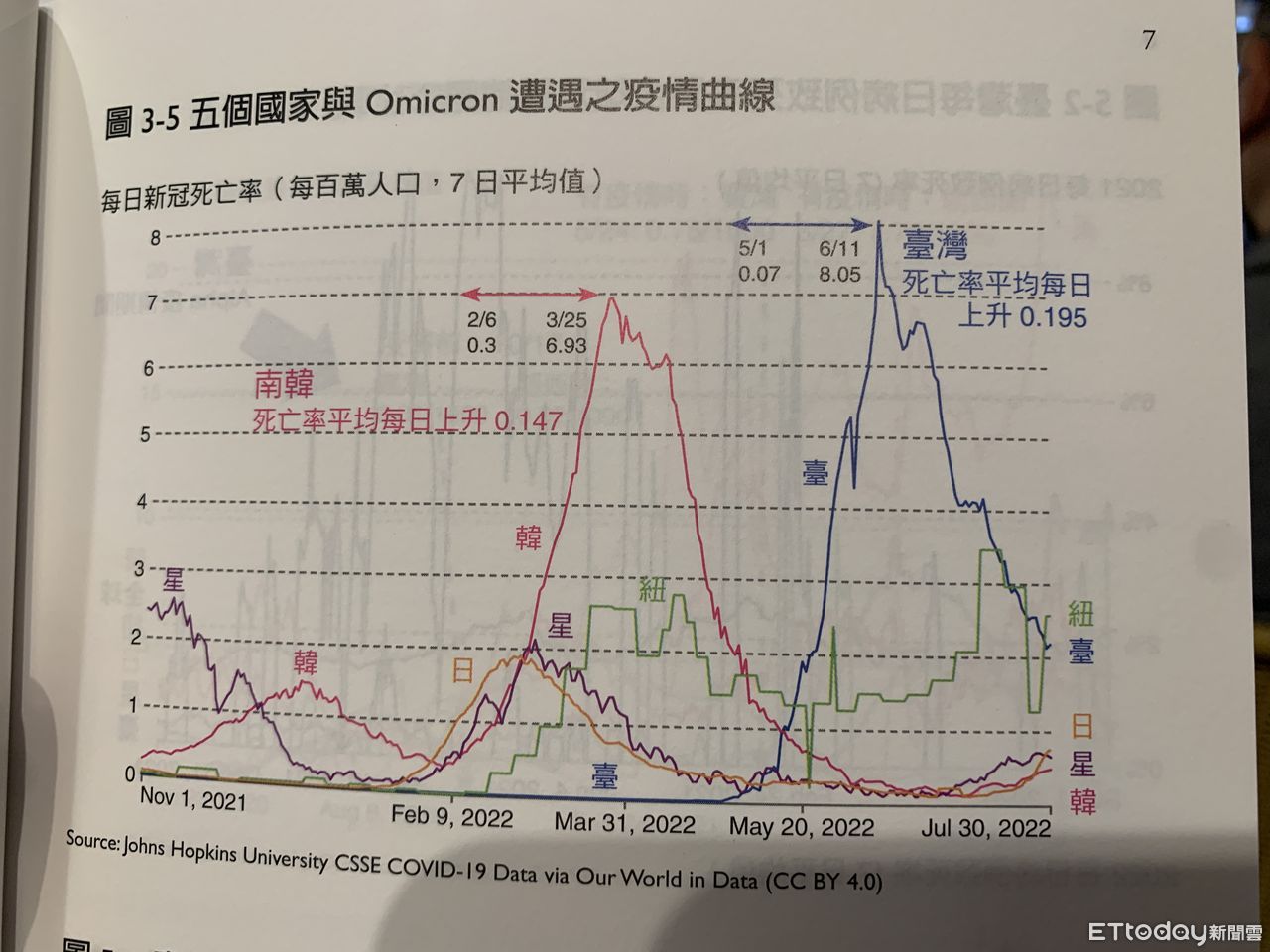 在新書她公開了台灣與各國新冠疫情的死亡率,可見新台灣模式之後,死亡率平均每日上升0.195,「我們衝得是最高、最陡的,日韓都沒像我們這樣!」