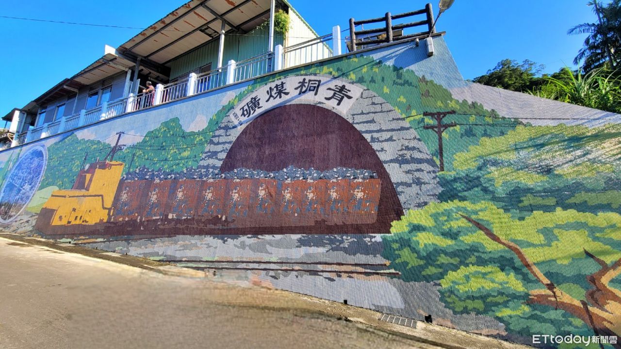 新北市平溪區公所歷時110天、以150萬片鶯歌陶瓷馬賽克拼貼而成的「平溪黑金煤礦歲月」景觀牆,今(7日)完工啟用,串連菁桐商圈的景觀牆長達80公尺,量體壯觀吸睛,透過一列獨眼小僧自青桐煤礦緩緩駛出鋪陳畫面,訴說平溪過往採煤故事,吸引許多遊客駐足拍照打卡。