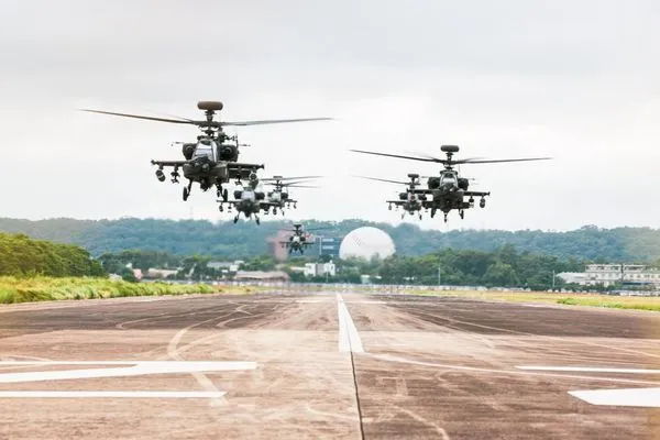 民國111年國慶總彩排7日下午登場,陸航5架AH-64E阿帕契攻擊直升機採編隊飛行方式,以整齊的大雁隊形慶祝國家慶典順利成功;起飛前,機組員進行直升機360度檢查,用細心與耐心確保國慶展演任務順利。
