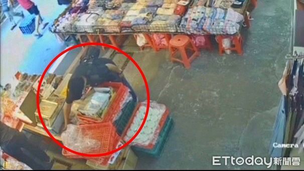 ▲攤商正在忙著招呼接待客人時,彭男趁沒有人注意他時,順手將放在攤位上的手機竊走。