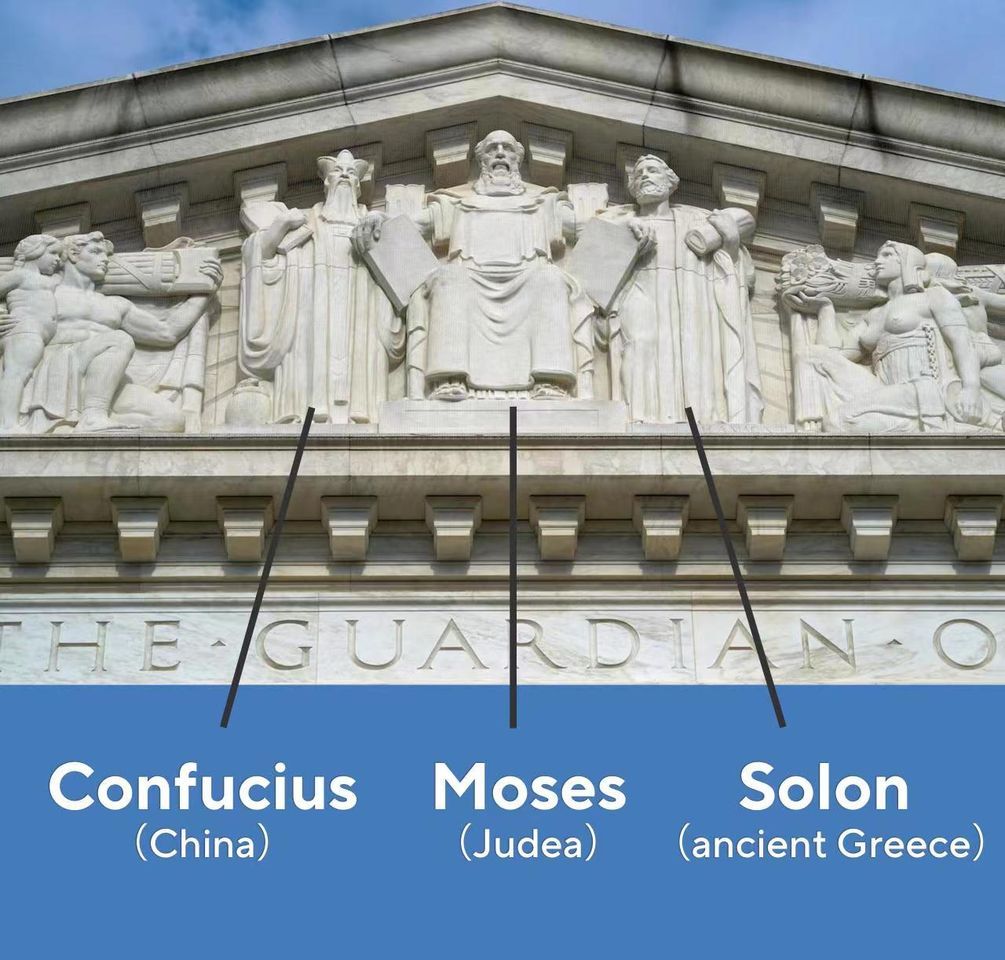 公開資訊顯示,美國最高法院大樓的三角形門楣上從左至右雕刻著孔子、摩西和梭倫的人物雕像。雕像設計者雕塑家赫蒙·阿特金斯·麥克尼爾((Hermon Atkins MacNeil)曾解釋創作初衷,「法律是文明的重要因素,美國的法律自然繼承或衍生於此前的文明中。因此,最高法院大樓的東側門楣雕像群寓意對源自東方的基本法律和戒律借鑒。摩西、孔子和梭倫被選為三大文明的代表,成為這一三角形門楣的中心雕像群。」